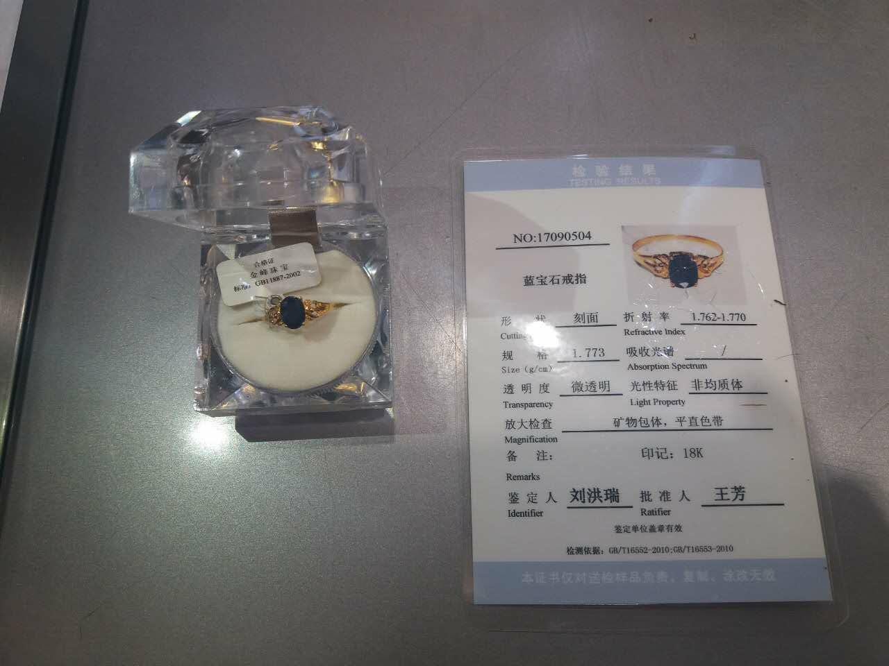 4、藍寶石戒指一枚,18K黃金鑲嵌,規格1.773g/cm。有省地礦出具檢驗報告。參考價500元。