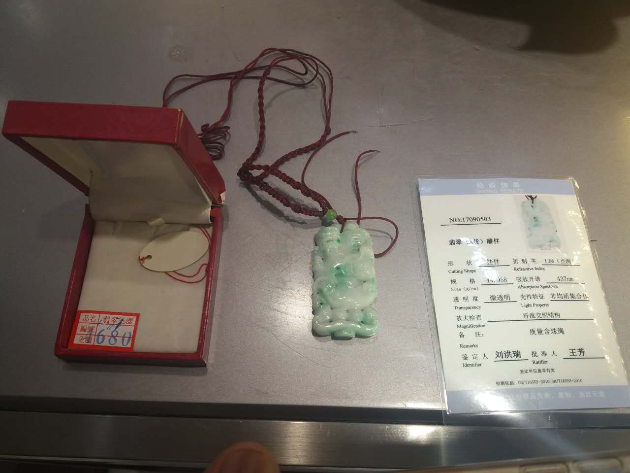 3、翡翠A貨掛件一件,規格44.968g/cm,有省地礦出具的檢驗報告。參考價1500元。