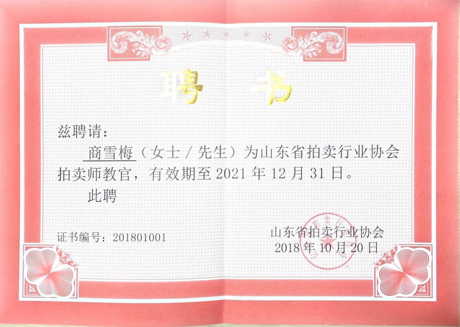 2018年10月20日,山東省拍賣師教官工作會議在泉城濟南順利召開。金諾國際拍賣有限公司董事長商雪梅、總經理位琳入選為山東省拍賣行業協會首批拍賣師教官,山東省拍賣行業協會會長李偉、山東省拍賣行業協會副會長、沃爾德集團董事長林擘分別向首批拍賣師教官頒發了聘書。